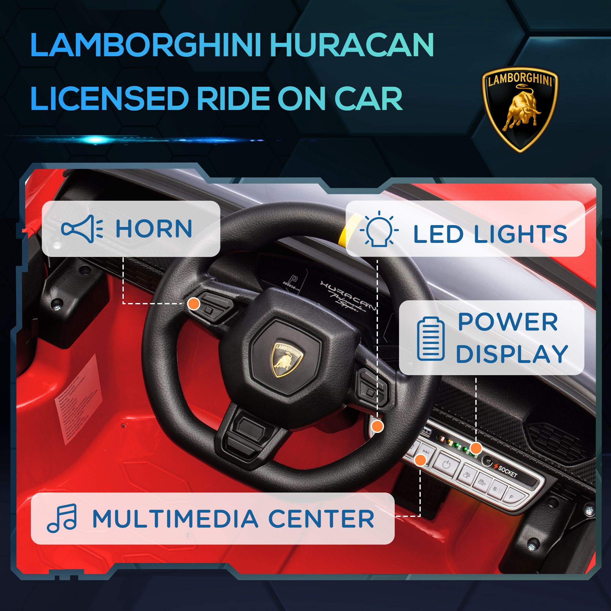 Licensed Lamborghini Design: This ride on car mimics the real Lamborghini Huracan with music, horn, LED lights, and a USB port for a realistic driving experience for your child.Easy Mobi