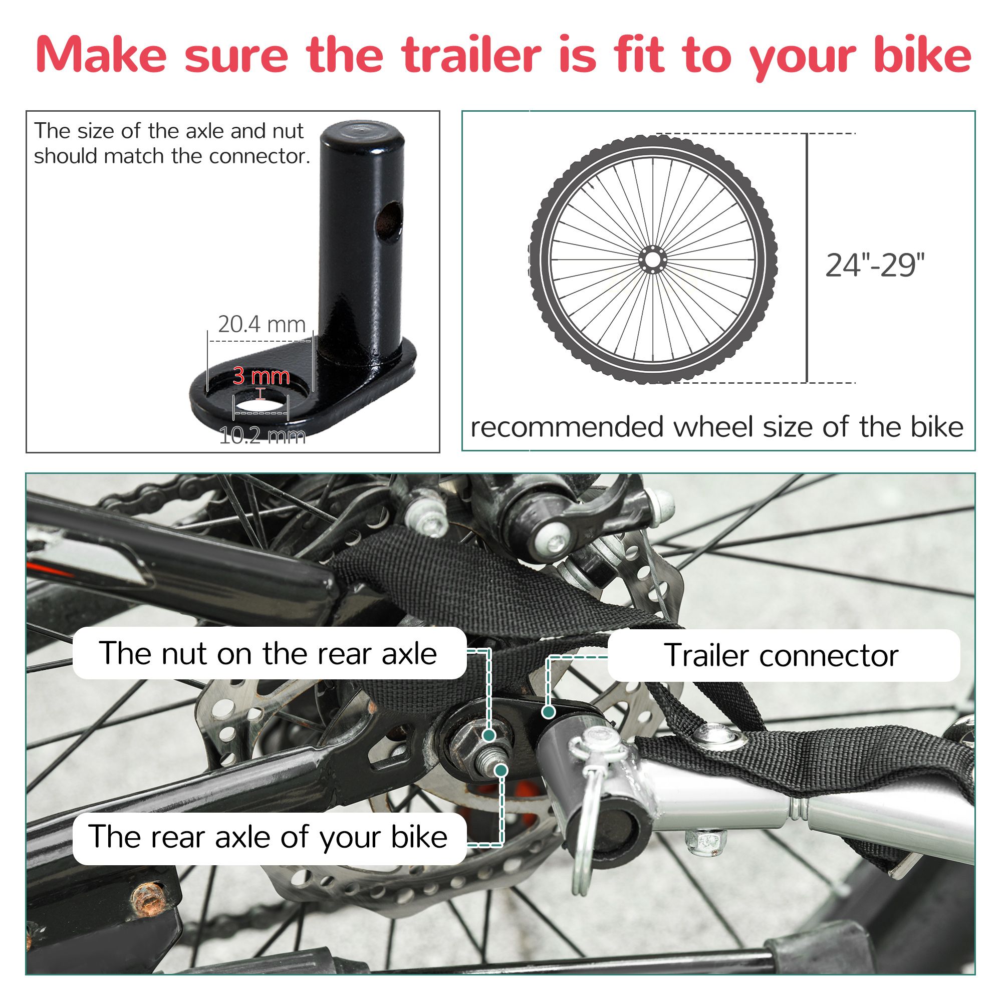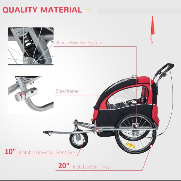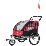Parents often love to share the things that they are into with their children. For cycling enthusiasts, as luck would have it, kids and the outdoors go naturally together. The Aosom Elite bicycle trailer for kids is perfect for that golden time when they’re starting to get inquisitive about the world around them but not quite old enough to ride on their own. Whether around the block or over rough terrain, Aosom’s child bike trailer got your covered on your way.Features:- Features a locking swivel front wheel and full suspension system for comfort and control- Durable all-steel frame with smooth-rolling 20" wheels for traversing uneven terrain- Suitable for 2 kids and each less than 40 lbs of weight, less than 43.25" of height- Sling-style pocketed seat with a five-point security harness for added protection- Includes an Aosom "Type A" bike hitch/coupler for easily connecting the trailer to a bicycle- Removable canopy helps shield from wind- Foldable to fit trunks and storage areas(Need to disassemble wheels, wheel guards, push handles, etc.) Specification:- Color: Red and Black- Material: Oxford Fabric, Steel Frame- Max Weight Limit: 88 lbs- Front wheel size: 10" x 2"- Rear wheel size: 20" x 1.75"- Overall Dimensions (with connector installed): 61" L x 34.75" W x 42.5" H- Foldable Dimension: 29.25"L x 25.5"W x 4.5"H- Cargo Size: 23.5" W x 30.25" D x 22" D- Applicable bicycle wheel size: Φ24"-Φ29"Package Includes:- 1 x Child Trailer- 1 x Manual